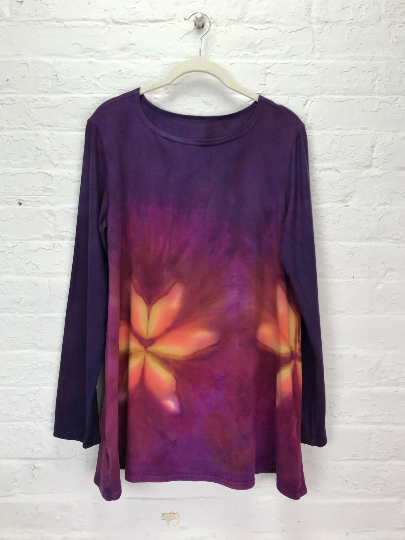 A luminous bloom glows through rich layers of violet, plum, and magenta — with petals radiating warm tones of amber and gold. This one-of-a-kind long sleeve tunic feels like sunset on fabric: soft, comforting, and full of quiet energy.
