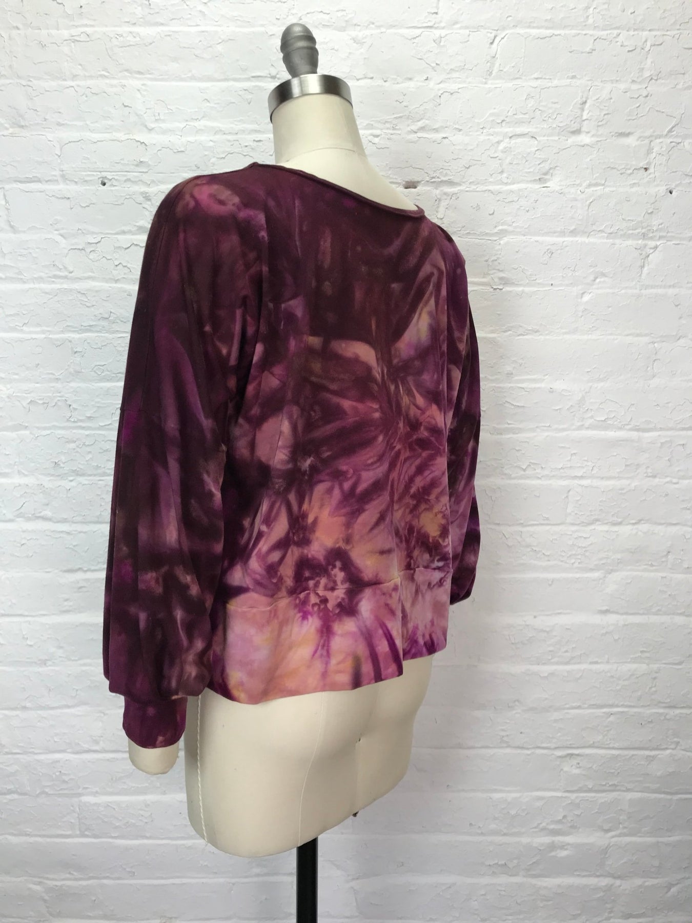 The Daphne is a relaxed long sleeve top with romantic poet sleeves. Each piece is designed, sewn and dyed by the artist. It's a versatile piece that blends comfort with artistic detail.